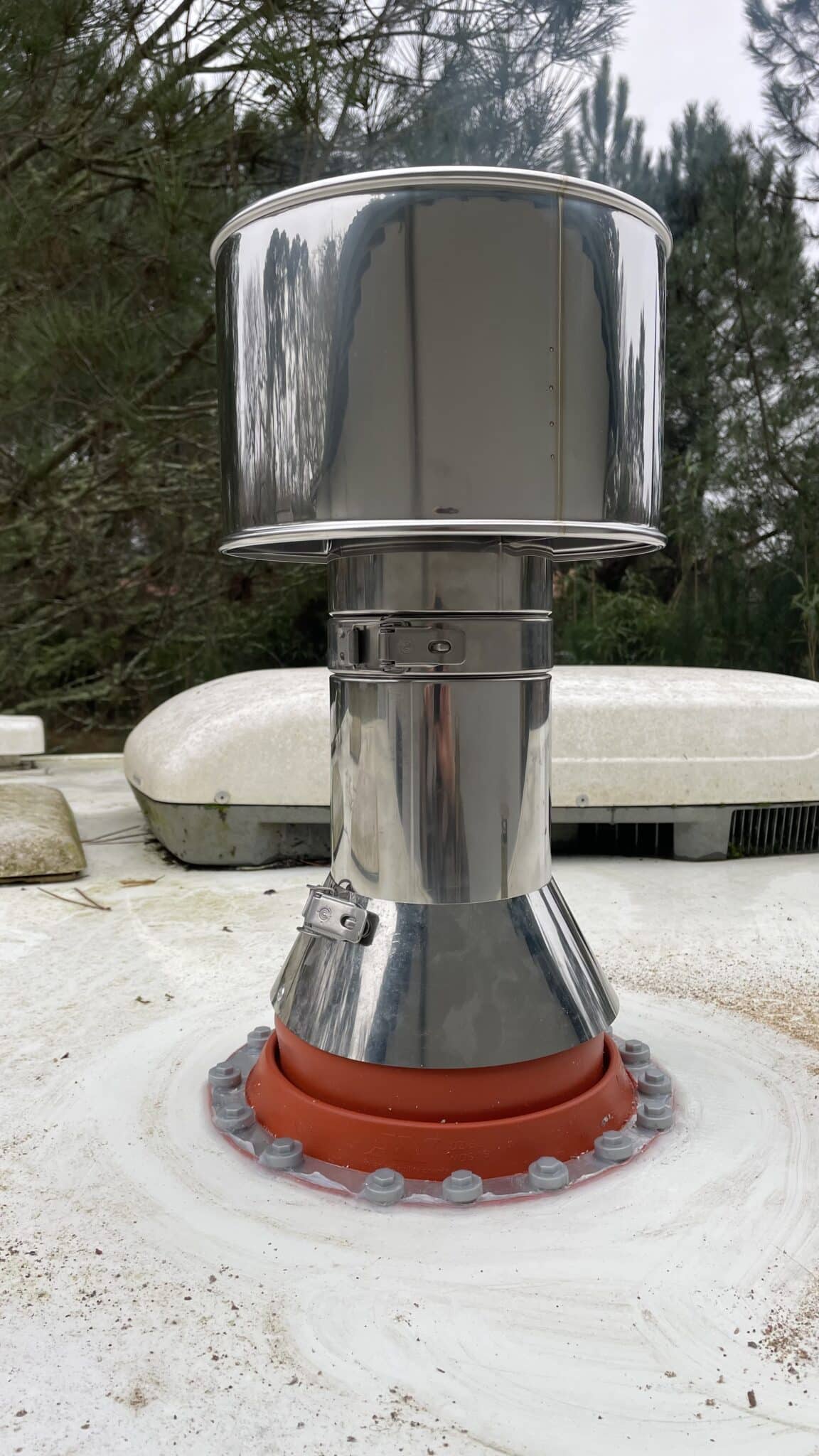 - Faites coulisser le solin le long du tube de cheminée et grimpez sur le toit de votre fourgon avec le tuyau, le kit de solin et le cône de finition pour procéder à l’assemblage.
