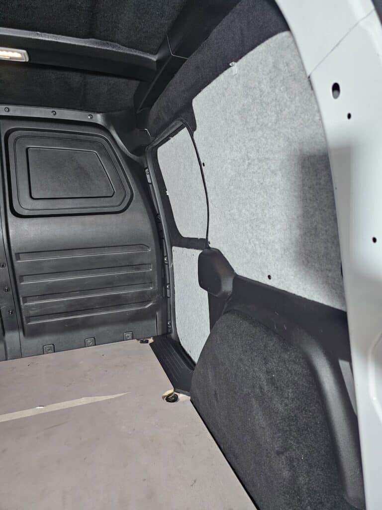 Voici un exemple d’application d’une feutrine d’habillage grise foncée sur les montants et portes du van de Bastien :