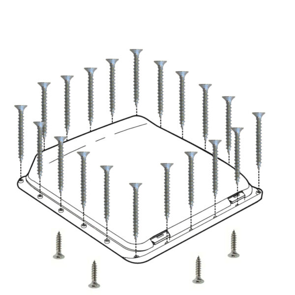 Chaque kit inclut 20 vis en acier inoxydable, conçues pour résister à la rouille, idéales pour l’attache extérieure et offrant une protection face aux éléments climatiques tout en prolongeant la durée de vie. Par ailleurs, quatre vis en acier viennent renforcer la fixation intérieure.