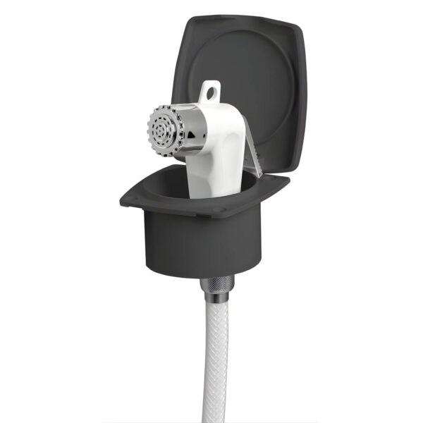 Un coffret douchette encastré à plat dans un plateau de meuble disparaît dans l’aménagement : le clapet affleure la surface, le flexible est contenu à l’intérieur, rien ne dépasse. Dans un van aux finitions soignées, cette discrétion vaut autant sur le plan fonctionnel que sur le plan esthétique. Le Boris Noir va plus loin : sa teinte sombre absorbe la lumière plutôt que de la réfléchir, ce qui le rend encore moins perceptible dans les aménagements à dominante foncée.