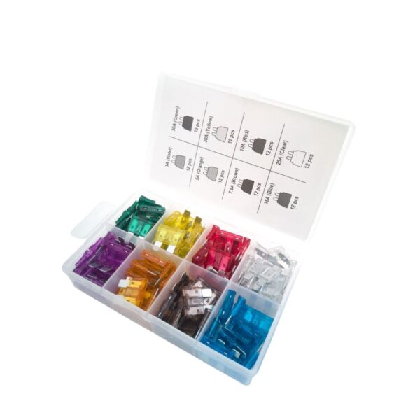 Pack de 96 fusibles à lames, de 3A à 30A, utiles pour les circuits 12V d’un van aménagé ou fourgon aménagé.